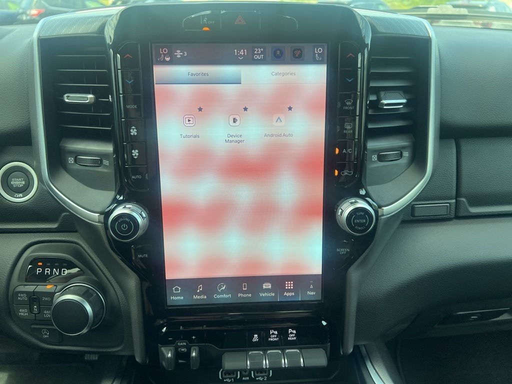 115V Auxiliary Power Outlet, 115V Auxiliary Rear Power Outlet, 12 Touchscreen Display, 3 Rear Seat Head Restraints, 4 Way Front Headrests, 4-Wheel Disc Brakes, 400W Inverter, 48V Belt Starter Generator, 4G LTE Wi-Fi Hot Spot, 6 Speakers, ABS brakes, Air Conditioning, Alloy wheels, AM/FM radio, Anti-Spin Differential Rear Axle, Apple CarPlay, Apple CarPlay/Android Auto, Auto High-beam Headlights, Auto Power-Folding Mirrors, Auto-Dimming Exterior Driver Mirror, Auto-Dimming Rear-View Mirror, Big Horn Level 2 Equipment Group, Black Exterior Mirrors, Black Interior Accents, Black Premium Power Mirrors, Body Color Door Handles, Body Color Fender Flares, Body Color Front Bumper, Body Color Tailgate Handle, Brake assist, Bucket Seats, Bumpers: chrome, Center Console Parts Module, Cloth Bucket Seats, Cluster 7.0 TFT Color Display, Compass, Configurable Drive Mode, Connectivity - US/Canada, Convex Wide-Angle Exterior Mirror Insert, Delay-off headlights, Deluxe Cloth Bucket Seats, Disassociated Touchscreen Display, Driver door bin, Dual front impact airbags, Dual front side impact airbags, Electronic Stability Control, Exterior Mirrors Courtesy Lamps, Front anti-roll bar, Front Bucket Seats, Front Center Armrest w/Storage, Front fog lights, Front reading lights, Front Seat Back Map Pockets, Front wheel independent suspension, Full Length Floor Console, Fully automatic headlights, Glove Box Lamp, Google Android Auto, GPS Antenna Input, GPS Navigation, Grille Surround 1 Body Color Texture 1 Black, HD Radio, Heated door mirrors, Heated Front Seats, Heated Steering Wheel, Illuminated entry, Integrated Center Stack Radio, Leather Wrapped Steering Wheel, LED Footwell Lighting, Low tire pressure warning, Manual Adjust 4-Way Driver Seat, Manual Adjust 4-Way Front Passenger Seat, Manual Folding Exterior Mirrors, Manufacturer's Statement of Origin, Occupant sensing airbag, Outside temperature display, Overhead airbag, Overhead console, Overhead LED Lamps, Panic alarm, ParkView Rear Back-Up Camera, Passenger door bin, Passenger vanity mirror, Power 2-Way Driver Lumbar Adjust, Power Adjust 8-Way Driver Seat, Power Adjustable Pedals, Power door mirrors, Power steering, Power windows, Premium Overhead Console, Quick Order Package 21Z Big Horn, Radio data system, RAM Grille Badge - Chrome, Rear 60/40 Folding Seat, Rear anti-roll bar, Rear Center Armrest, Rear Power Sliding Window, Rear step bumper, Rear Wheelhouse Liners, Rear Window Defroster, Remote keyless entry, Remote Tailgate Release, Security Alarm, SiriusXM Radio Service, Speed control, Sport Appearance Package, Steering Wheel Mounted Audio Controls, Supplier Part Tracking (J-1), Tachometer, Telescoping steering wheel, Tilt steering wheel, Traction control, Trailer Brake Control, Trip computer, Universal Garage Door Opener, USB Host Flip, Variably intermittent wipers, Voltmeter, Wheels: 18 x 8 Cast-Aluminum Painted.
